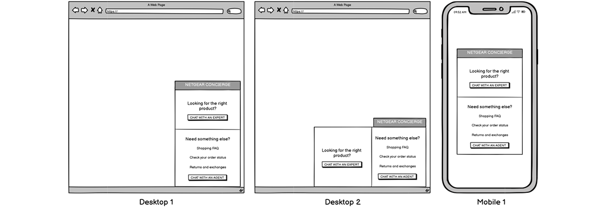 After receiving approval for the above layouts, I designed several initial prototypes. These prototypes iterated on the wireframes and incorperated high-fidelity functionality to the concept. This included a collapsed state, a chat interface, and an exit option. I opted for a minimalist look and feel that aligned with NETGEAR’s existing design language. To ensure that these prototypes aligned with stakeholder input, there is a lot of copy, which was a concern to me as I felt that it complicated the user experience. However, I designed to the criteria, knowing that we planned on user testing this on the live site.